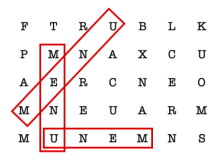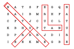 - 单词出现在两条相互垂直且存在公共端点的线段上。也就是说,单词首先出现在某线段上,直到某个字母后,转向 90 度,其余部分出现在另一条线段上。