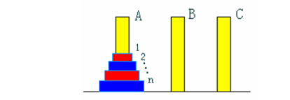 设A、B、C是3 个塔座。开始时,在塔座A 上有一叠共n 个圆盘,这些圆盘自下而上,由大到小地叠在一起。各圆盘从小到大编号为1,2,……,n,奇数号圆盘着蓝色,偶数号圆盘着红色,如图所示。现要求将塔座A 上的这一叠圆盘移到塔座B 上,并仍按同样顺序叠置。在移动圆盘时应遵守以下移动规则: