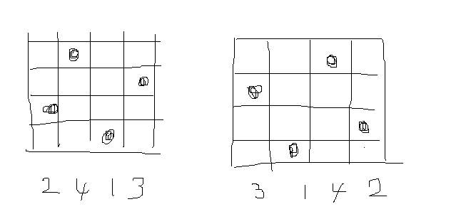 若有解,输出若干行,每行n个数,依次表示第i个皇后的列号
