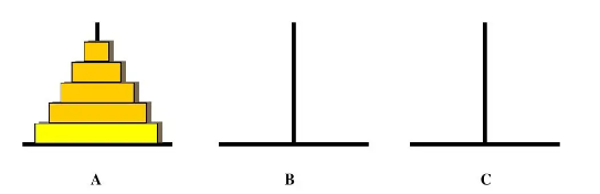 约19世纪末,在欧州的商店中出售一种智力玩具,在一块铜板上有三根杆,最左边的杆上自上而下、由小到大顺序串着由64个圆盘构成的塔。目的是将最左边杆上的盘全部移到中间的杆上,条件是一次只能移动一个盘,且不允许大盘放在小盘的上面。