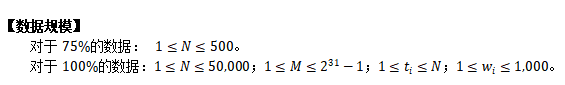 首先,比赛时间分为 N 个时段,她又给出了很多小游戏,每个小游戏都必须在规定期限 ti 前完成(包括边界时间 ti )。如果一个游戏没能在规定期限前完成,则要从奖励费 M 元中扣去一部分钱 wi(wi为自然数),不同的游戏扣去的钱可能不一样的。当然,每个游戏本身都很简单,保证每个参赛者都能在一个时段内完成,而且都必须从整时段开始。主持人只是想考考每个参赛者如何安排组织自己做游戏的顺序。作为参赛者,小伟很想赢得冠军,当然更想赢取最多的钱!注意:比赛绝对不会让参赛者赔钱。
