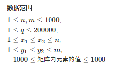 输入一个 n 行 m 列的整数矩阵,再输入 q 个询问,每个询问包含四个整数 x1,y1,x2,y2,表示一个子矩阵的左上角坐标和右下角坐标。