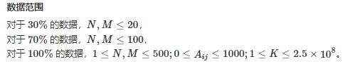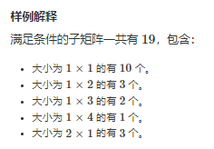 给定一个 N×M 的矩阵 A,请你统计有多少个子矩阵 (最小 1×1,最大 N×M) 满足子矩阵中所有数的和不超过给定的整数 K?