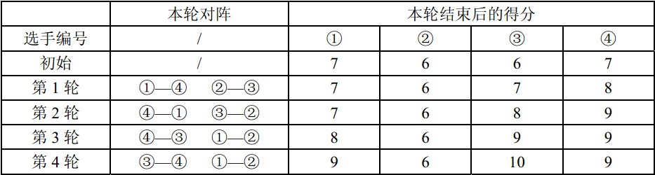 每轮比赛的对阵安排与该轮比赛开始前的排名有关:第1名和第2名、第3名和第4名、...、第2K–1名和第2K名、...、第2N–1名和第2N名,各进行一场比赛。每场比赛胜者得1分,负者得0分。也就是说除了首轮以外,其它轮比赛的安排均不能事先确定,而是要取决于选手在之前比赛中的表现。