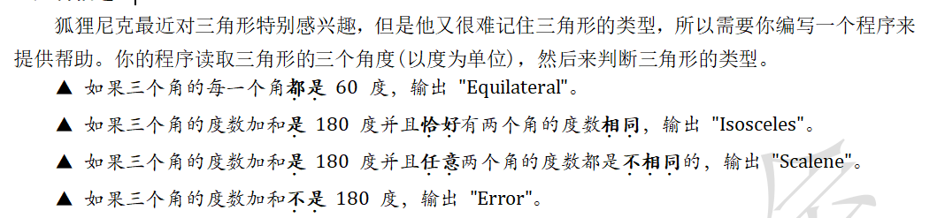 输入由三个整数组成,每个整数位于单独的一行。每个整数将大于 0 并且小于 180 。