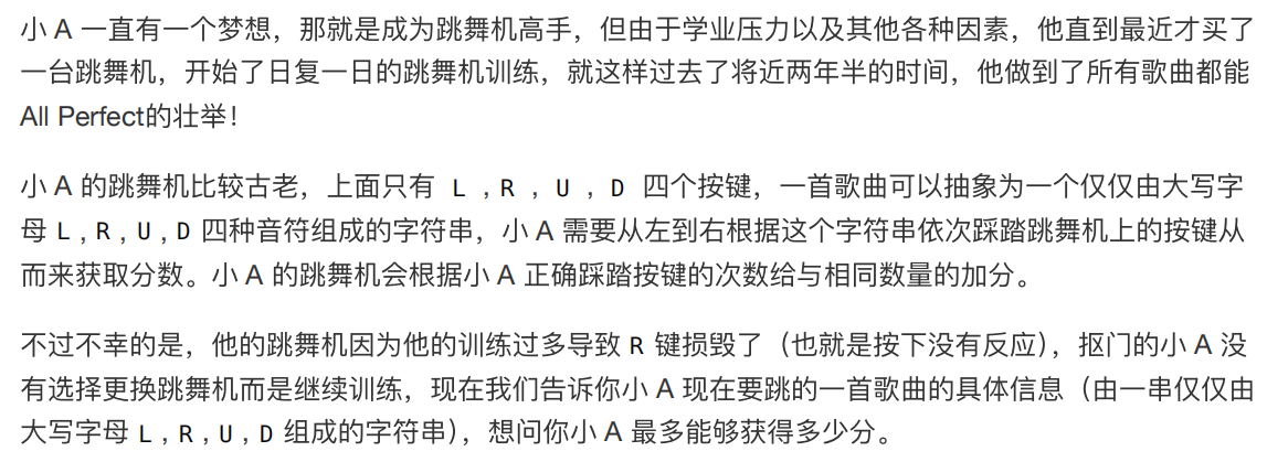 ⼀⾏仅仅由⼤写字⺟ L, R, U, D 组成的字符串 S (1 ≤ ∣S∣ ≤ 104 )