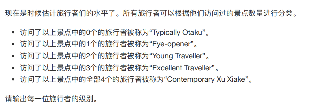 对于每个测试用例,输出一行,包含一个字符串,表示旅行者的分类,可能的取值为 "Typically Otaku"、"Eye-opener"、"Young Traveller"、"Excellent Traveller" 和 "Contemporary Xu Xiake"(不带引号)。