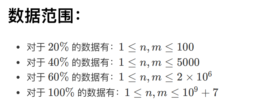 输⼊⼀⾏,读⼊两个数, n, m ( 2 ≤ n, m ≤ 109 + 7) ,分别代表⻓和宽包含的格点数。