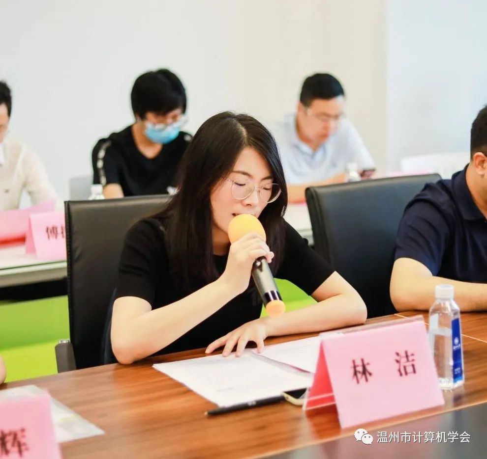 林洁作为兄弟城市学会秘书长,首先对温州市计算机学会信息素养专委会的成立表示祝贺,并介绍了宁波市计算机学会的发展过程,以及与青少年信息素养相关的两个品牌活动,青少年编程能力等级测评和宁波市计算机教育大会,并希望能够和兄弟学会共同推进打造“数字教育”的新征程,共谋两地青少年信息素养教育高质量发展。